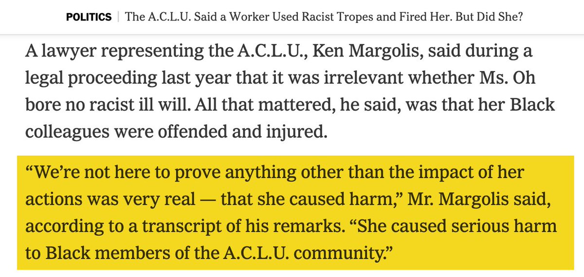 Gift article about the ACLU -- about how an Asian employee often accused her bosses of harassment, only to then get fired for racism since her bosses she complained about were black, and now ACLU is arguing for an expanded definition of "hate speech": https://www.nytimes.com/2024/03/22/us/politics/aclu-employee-fired-race-bias.html