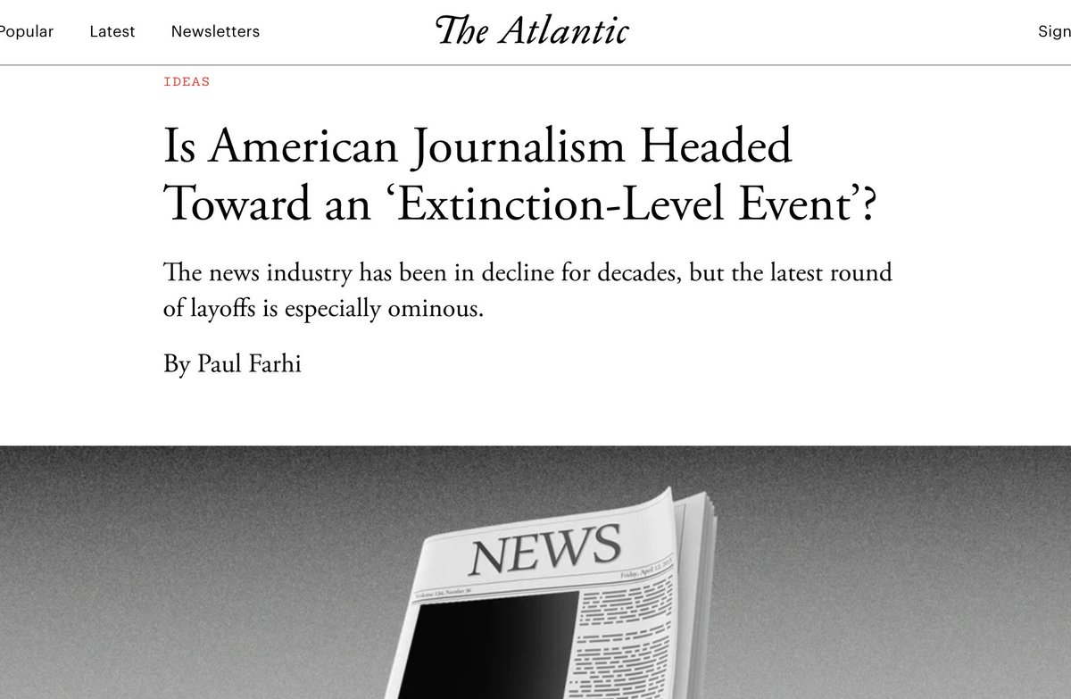 No, "American journalism" is not headed for an "extinction-level event." Corporate journalism is, and deservedly so: including the @Atlantic is: not even Steve Jobs' inherited fortune can save them. Independent journalism is thriving. This is the reality they can't accept.