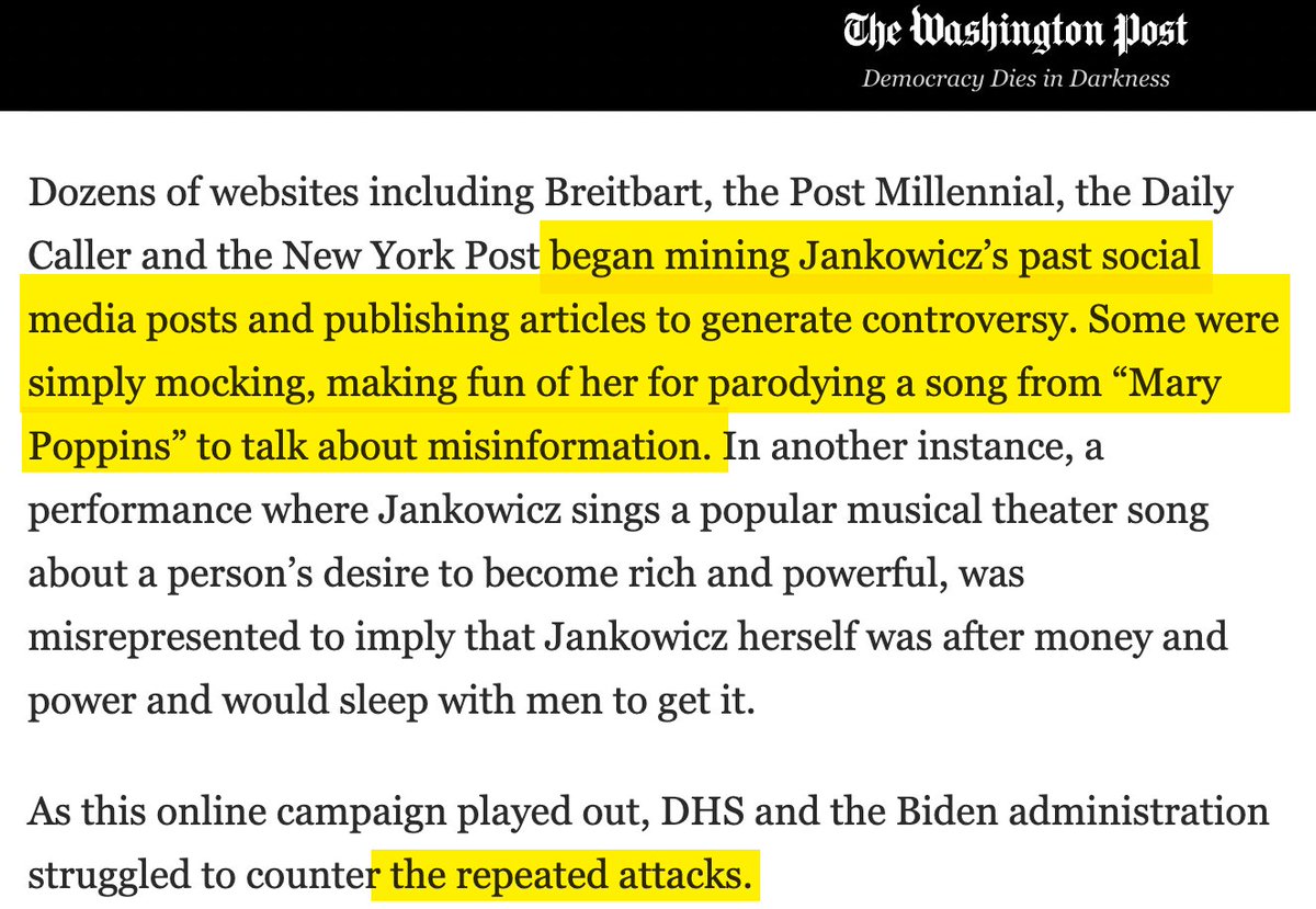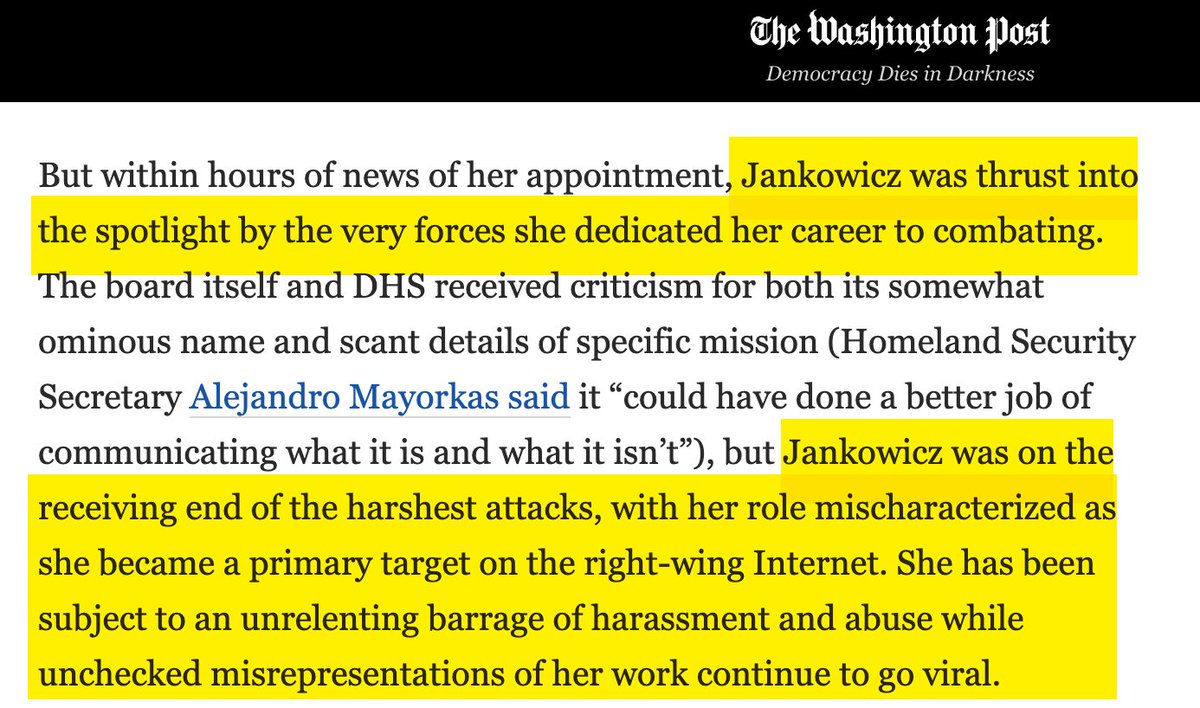 The other bizarre aspect of the Nina-Jankowicz/@TaylorLorenz saga: Taylor depicts this poor, marginalized DHS official as the victim of "right-wing" disinformation, when the most devastating investigative piece on her was this one last week in @TheNation: https://www.thenation.com/article/politics/meet-the-head-of-bidens-new-disinformation-governing-board/