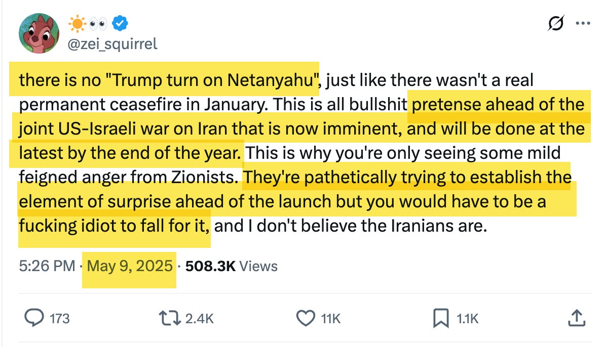 The @zei_squirrel is a prophet. When virtually everyone believed there was some acrimonious Trump/Netanyahu split and Trump was determined to prevent Israel from bombing Iran, only to now learn that the whole thing was a ruse as the US and Israel jointly planned the attack. https://t.co/O1b68RtXj6