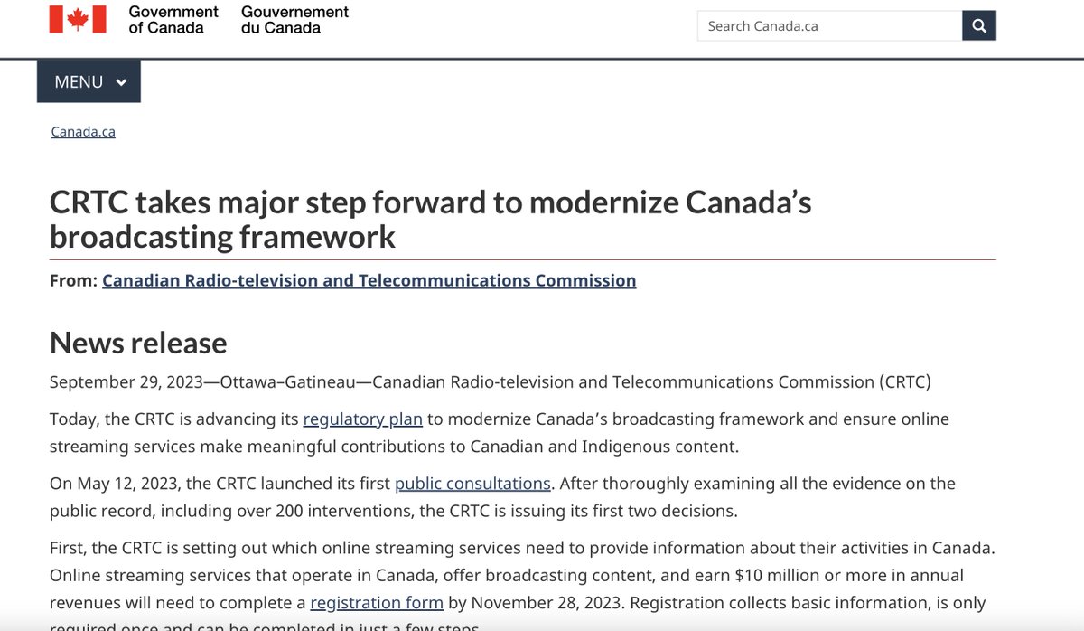 The Canadian government, armed with one of the world's most repressive online censorship schemes, announces that all "online streaming services that offer podcasts" must formally register with the government to permit regulatory controls: https://canada.ca/en/radio-television-telecommunications/news/2023/09/crtc-takes-major-step-forward-to-modernize-canadas-broadcasting-framework.html