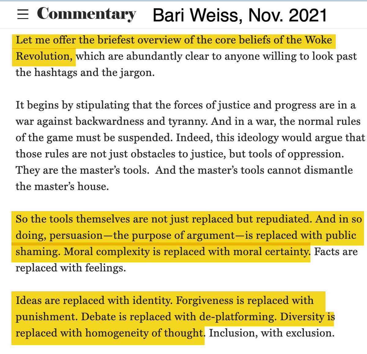 The essay in Commentary by Bari Weiss from which that excerpt is taken, "Say No to the Woke Revolution," is below. It warns of the evils of firing people by accusing them of bigotry, and of the moral urgency of debating not de-platforming opponents: https://www.commentary.org/articles/bari-weiss/resist-woke-revolution/