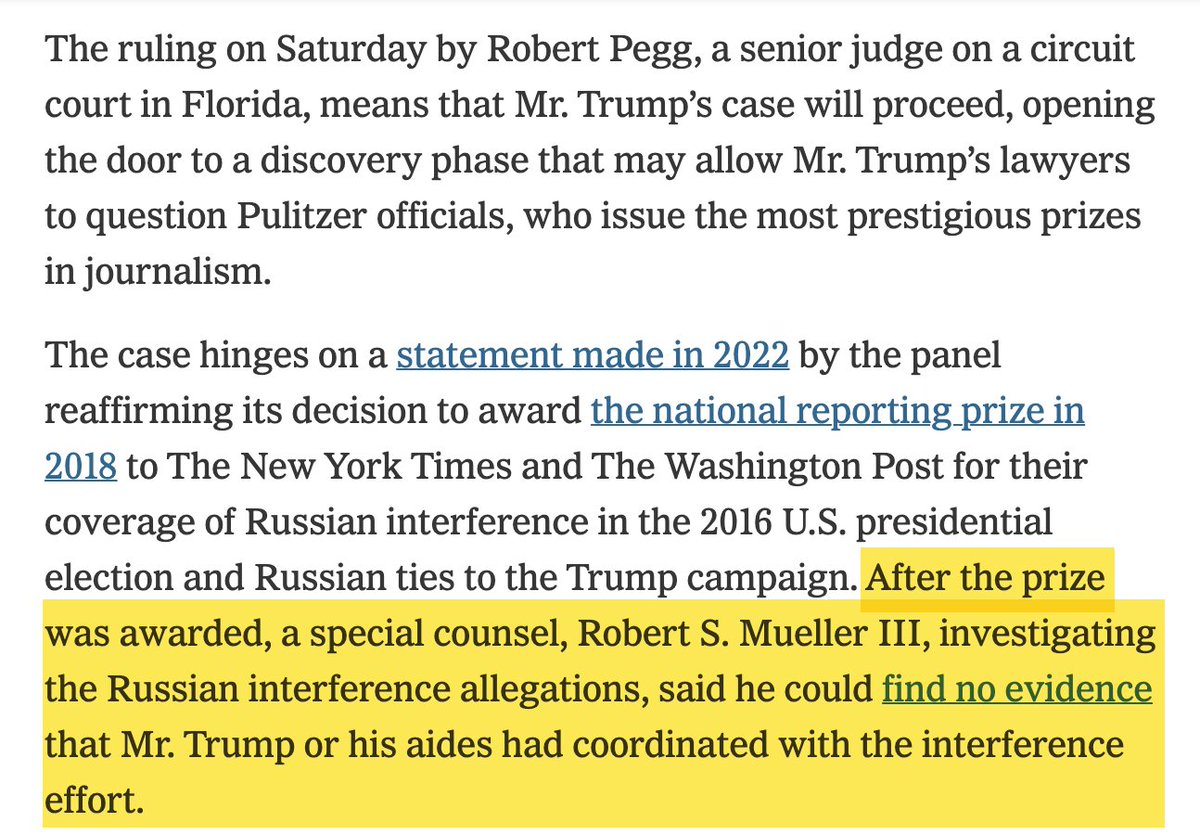 A senior state court judge refused to dismiss a defamation lawsuit brought by Trump against the Pulitzer Board. The Board gave Pulitzers to NYT and WPost for their repeated echoing of the Russiagate fraud. Here's what even NYT admitted when reporting on the court ruling:👇 https://t.co/FbwVMWmEjt