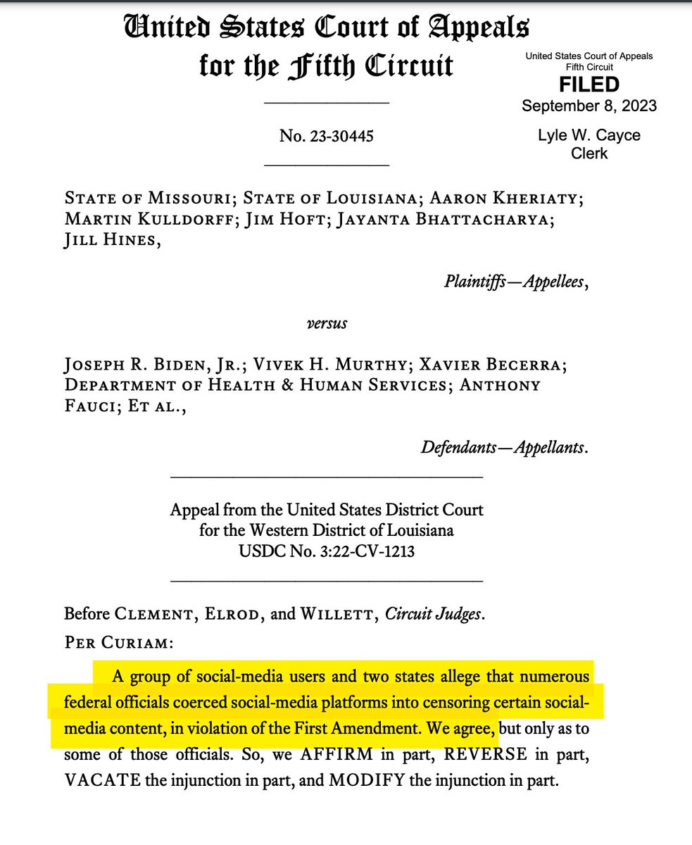 Speaking of fascism: an appellate court just largely upheld a lower court ruling that key parts of the US Govt -- FBI and WH -- unconstitutionally threatened and forced tech platforms to censor speech they disliked. What weight does the "Vote Blue!" crowd assign this, if any?