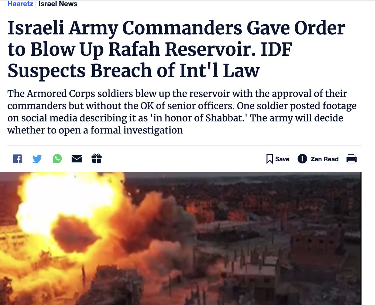 Israeli troops, with the support of commanders, deliberately exploded the main water reservoir serving Rafah in southern Gaza, then posted it online. There is no possible military justification. It's a classic crime against humanity. Even IDF is investigating it as such. https://t.co/FP4HqmJEb3
