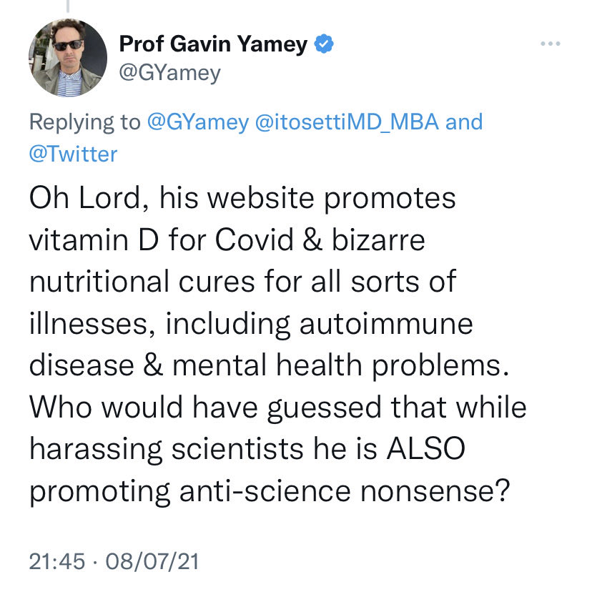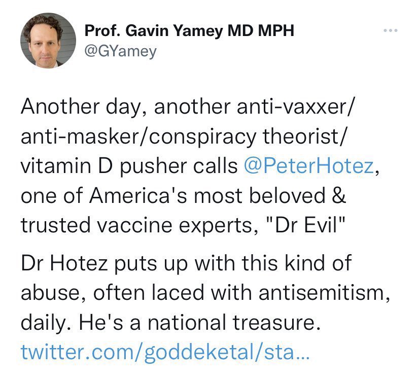 #2 Gavin Yamey (@GYamey) says Peter Hotez is a “national treasure” and calls people who promote vitamin D conspiracy theorists. Imagine simping this hard for a guy who dodges debates and shills for pharma. Next clown.