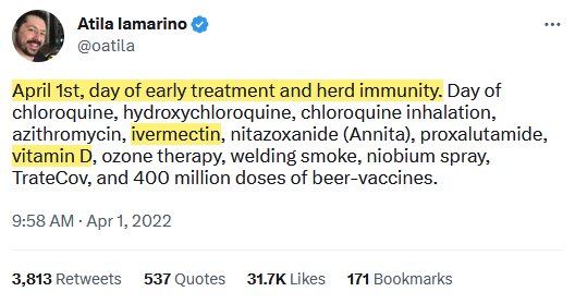 @Marc_Veld @sunfluencer @GidMK @raouljdegroot @EricTopol @Friedemann1 #11 Atila Iamarino (@oatila), Brazil’s favorite lockdown cheerleader, mocks early treatment and vitamin D — right alongside welding smoke and beer vaccines. That’s what happens when a failed scientist becomes a Big Pharma whore. Last clown.