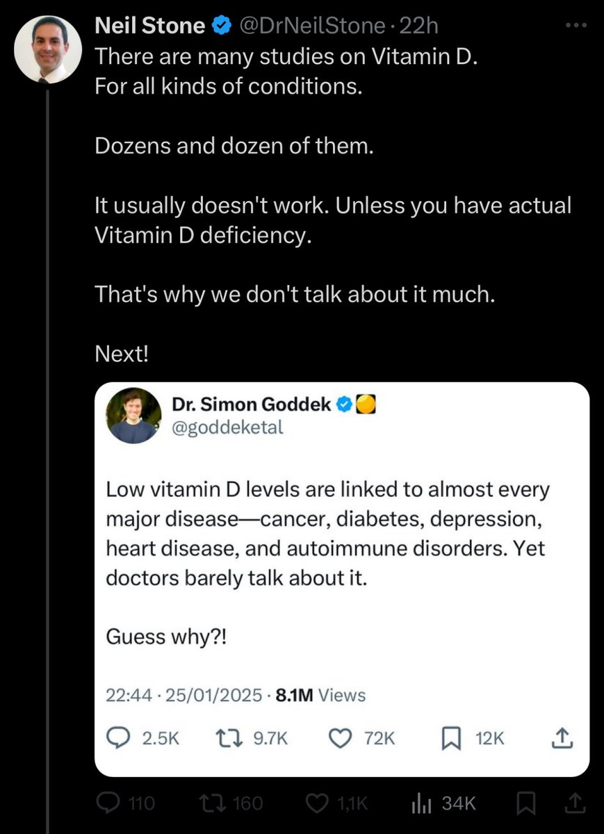 #1 Neil Stone (@DrNeilStone) says we don’t talk about vitamin D because it only works if you’re deficient. That’s… literally how vitamins work, Neil. Next clown.