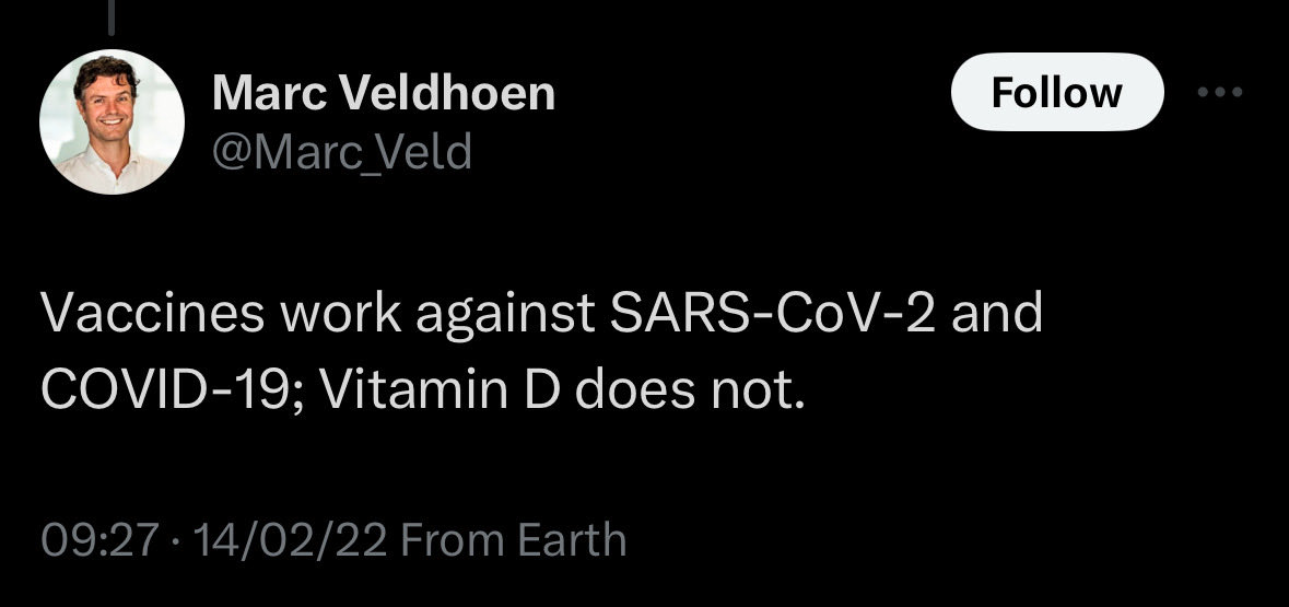 #4 Marc Veldhoen (@Marc_Veld), an actual professor of immunology, says vitamin D doesn’t work against COVID. Imagine teaching immunology and still not knowing that vitamin D is essential for immune function. You’d have to work really hard to be this blind. Next clown.