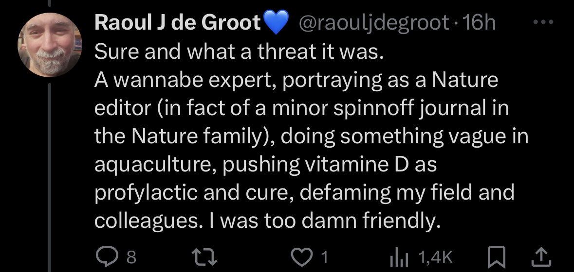 @Marc_Veld @sunfluencer @GidMK #7 Raoul de Groot (@raouljdegroot) is a virologist who’s been simping for Drosten & Fauci since day one. This is the same guy who studied animal coronaviruses and still missed the part where human immunity needs vitamin D. The irony? He calls others wannabe experts. Next clown.
