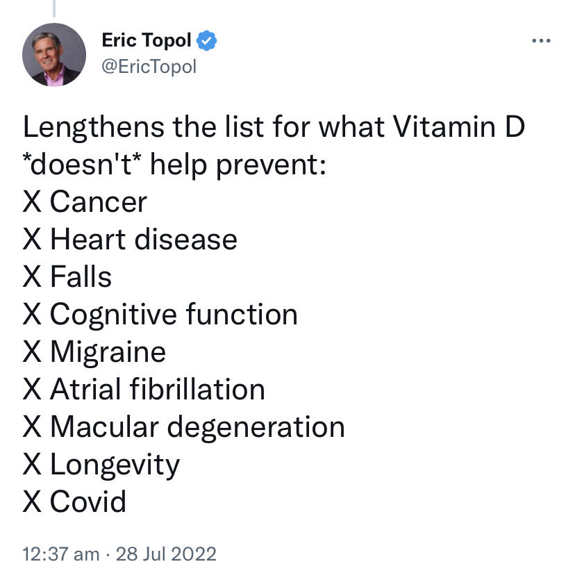 @Marc_Veld @sunfluencer @GidMK @raouljdegroot #8 Eric Topol (@EricTopol) says vitamin D doesn’t help prevent anything — not even COVID, heart disease, or cancer. Bold take from a guy who once called mRNA shots “miracles” while ignoring all the athletes dropping like flies. Next clown.