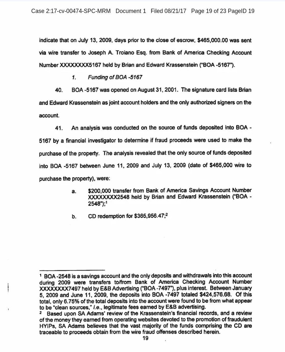 11/ That money came from a Bank of America account in their name. It included $200,000 from their advertising business and a $365,000 CD redemption. Investigators found that most of these funds were traceable to HYIP proceeds. It wasn’t speculation. It is well-documented. https://t.co/eZYS9Pv9ov