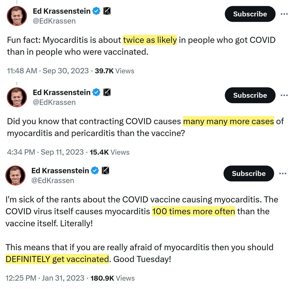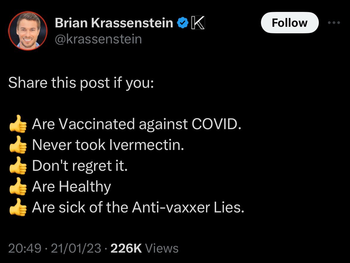 18/ Speaking of COVID: The Krassensteins’ COVID-era posts and statements mirrored their deceptive tactics, sounding like Big Pharma scripts and making no sense. Well, anyone foolish enough to trust them on medical questions has only themselves to blame. https://t.co/rzN7JGo8WA