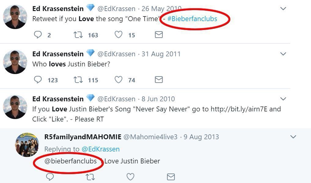 2/ The Krassensteins' political careers didn’t begin with policy or journalism. Brian and Ed began by targeting teenage fan communities. Edward ran @bieberfanclubs, Brian ran @JONASBROTHER5. These accounts, followed by teen girls, were later renamed and repurposed for politics. https://t.co/L5PL73LPth