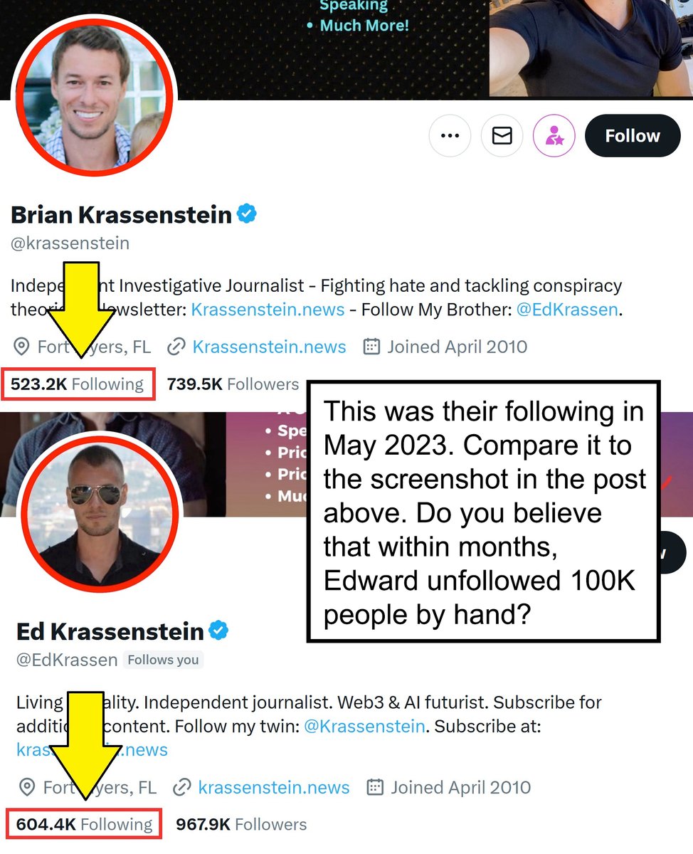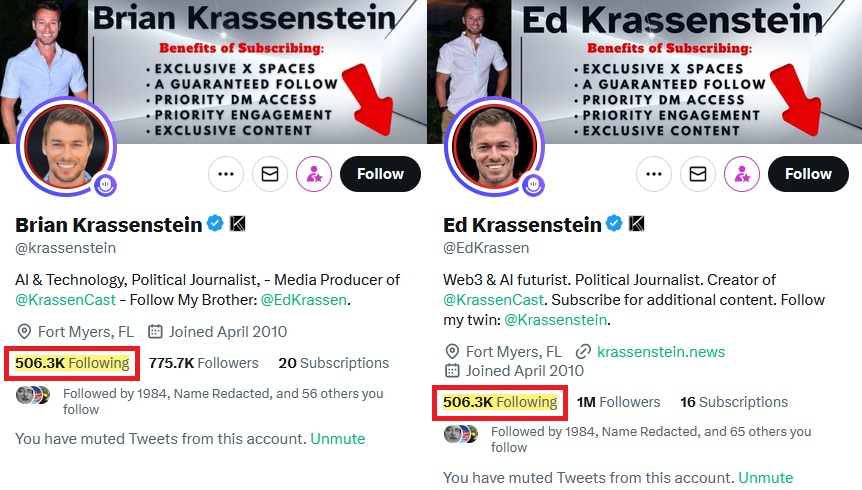 4/ Brian and Ed likely used follow-unfollow scripts—tools that mass-follow users to gain follow-backs, then unfollow non-returners. This violates X guidelines. Until recently, both followed exactly 506.3K accounts, a number that hints at automation, not organic growth. https://t.co/njBwlAUIj8