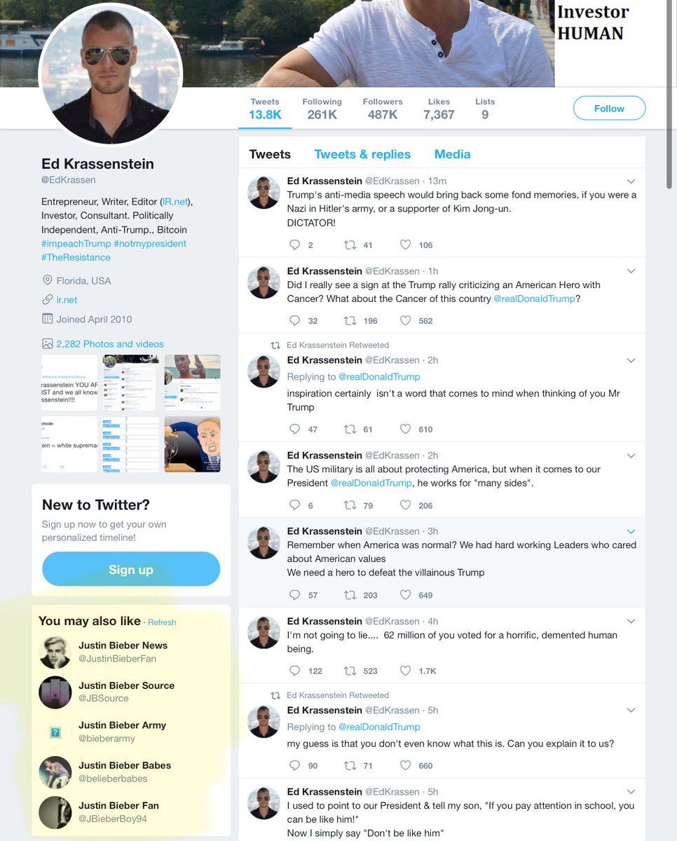 6/ Once their follower counts were artificially inflated, they rebranded the accounts. Ed became @EdKrassen, Brian became @krassenstein. Both jumped on the Trump-resistance train and became full-time reply guys under every Trump tweet to farm engagement. https://t.co/RSULZ0Lbpy