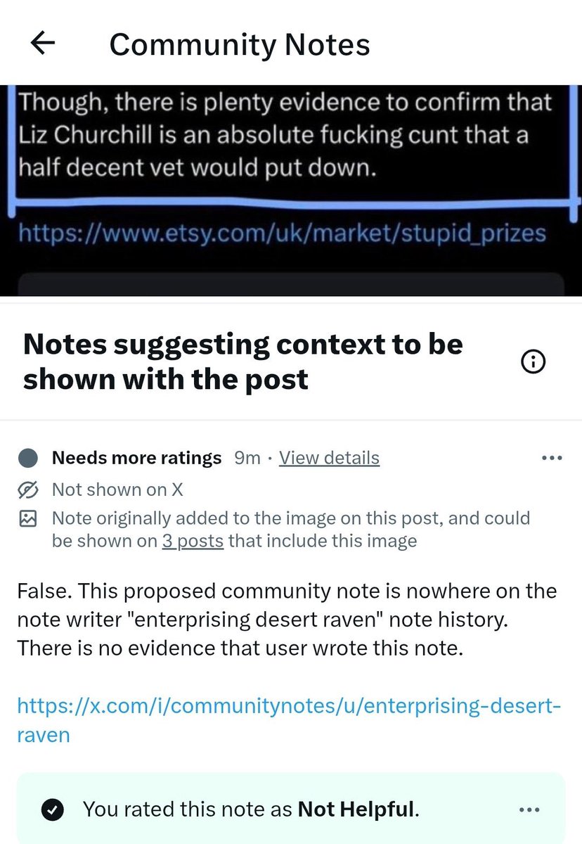 🚨‘Enterprising Desert Raven’ is now using his second Community Notes account, “Resplendent Cedar Osprey,” to gaslight the platform, claiming the ‘death threat note’ that he himself wrote and later (got) deleted never existed. WHAT THE FVCK??????? This is targeted harassment, system abuse, and political censorship. @CommunityNotes immediately needs to: – Admit the Note existed. – Disclose why it was deleted. – Ban Ryan T. from the platform and all moderation roles. – Get their employee @_jaybaxter_ under control. Enough is enough. CC: @elonmusk, @Safety