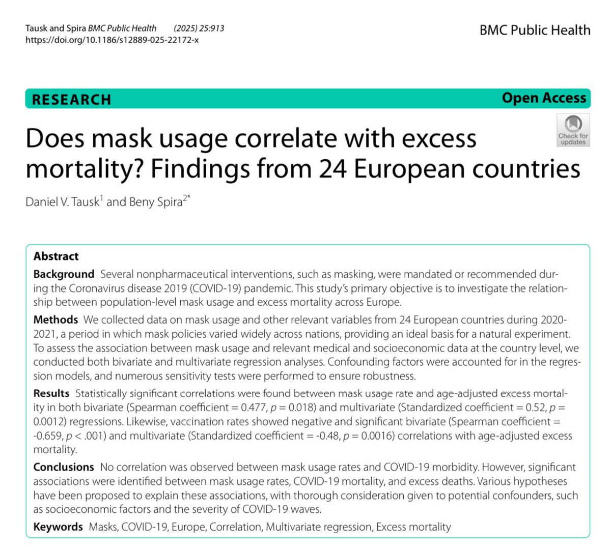 🚨NEW: Brazilian study confirms what we knew all along—mask mandates not only failed to stop COVID but may have actually contributed to excess mortality. The so-called “experts” pushed a cult-like obsession with masks, silencing anyone who dared to question them. Now, academia is quietly admitting the truth—far too late, but better late than never. It’s time for those who were demonized, censored, and fired for speaking the truth to be fully vindicated. Link to study: https://bmcpublichealth.biomedcentral.com/articles/10.1186/s12889-025-22172-x