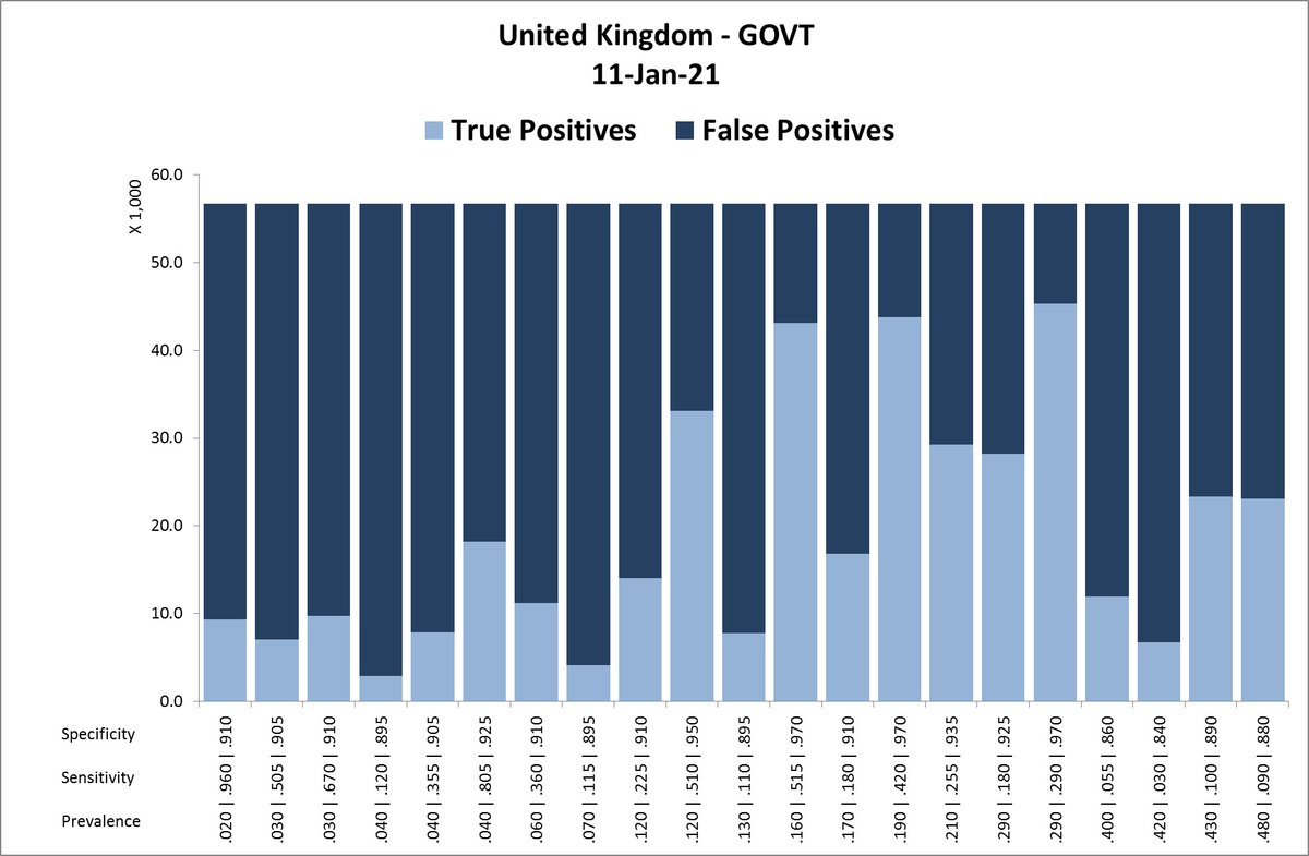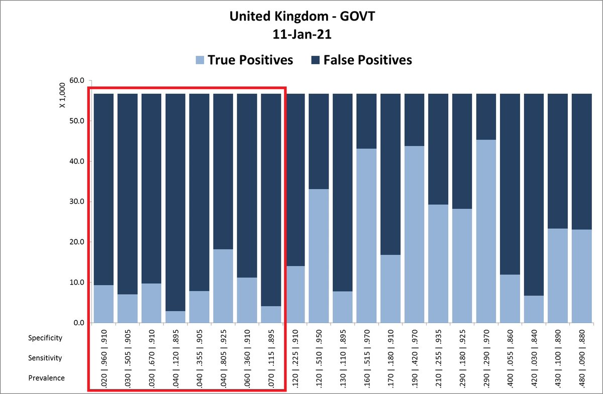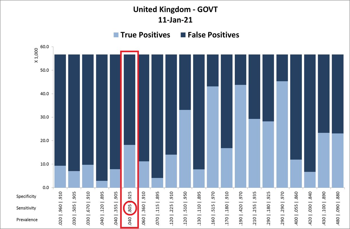 13/ So on January 11th, the prevalence was most likely about 4%, the tests’ sensitivity about 80.5%, and the tests’ specificity about 92.5% (which is much lower than the claimed 98.9%: https://bit.ly/2Y5nEjf). The false-positive rate that day would consequently have been 68%!