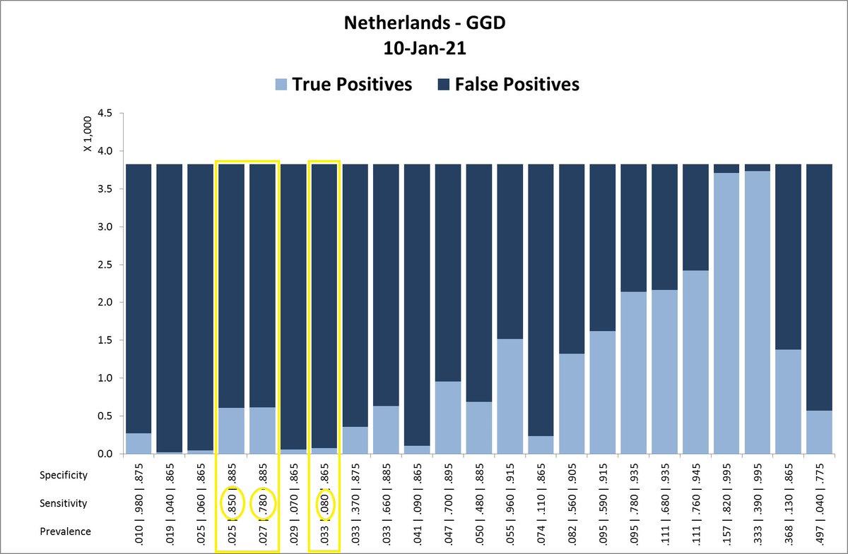 15/ AFAIK, the #Dutch government did not make a recent comment about prevalence, but we can assume a similar one as in the UK. Also, the sensitivity should be in the range of 75-85%, leaving us with the following possible scenarios. Remark: note the low #specificities < 90%.