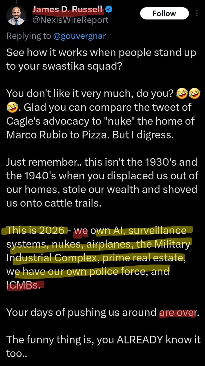 @TheRealSantino Why Muslims are of zero threat, proportional to the threat of the ZOG Muslims are not attempting to command surveillance and AI, nor are they embedding into critical infrastructure or global tech firms. https://t.co/S9C4GGsBNc