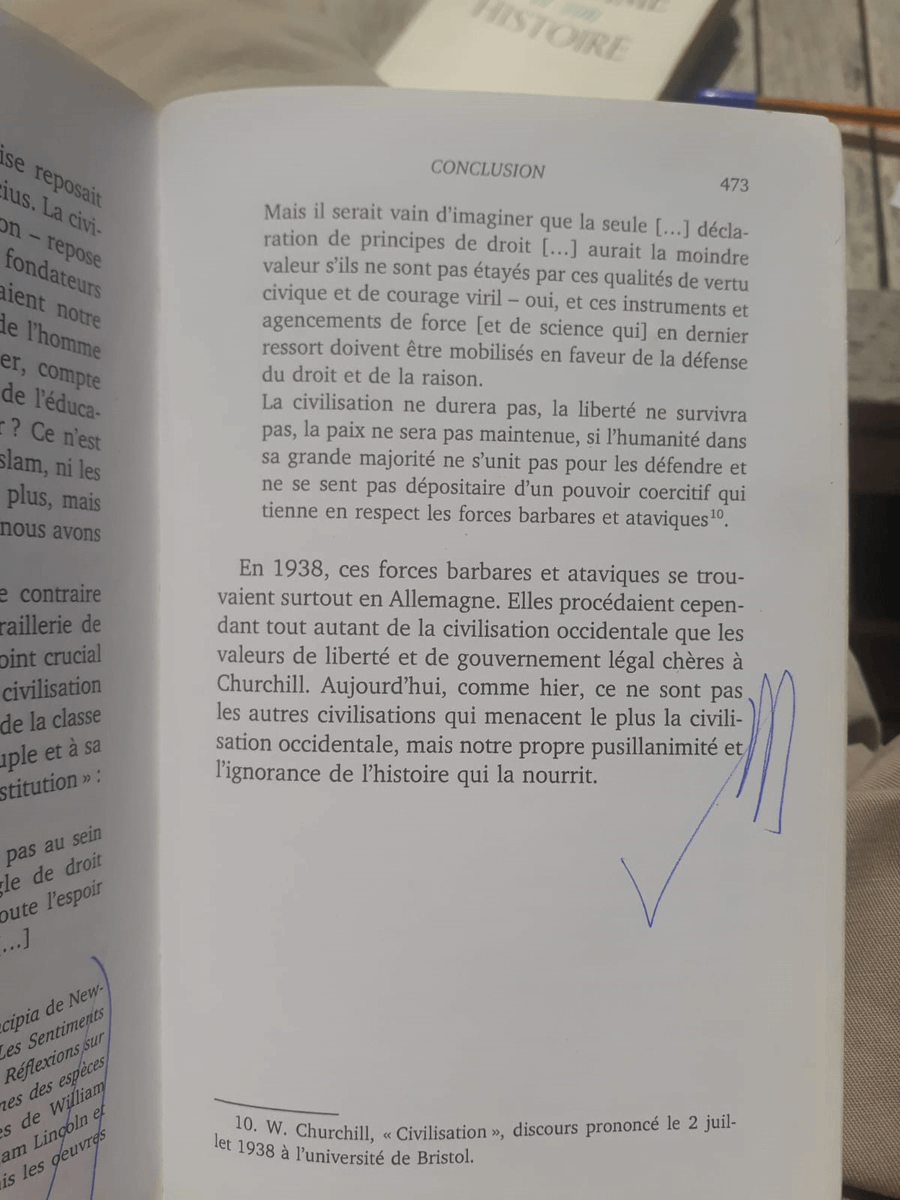 Conclusion : soyons conscients de l'identité et des particularités de notre civilisation occidentale et préservons-la. “Il se pourrait que la véritable menace contre l’Occident (...) vienne de notre méconnaissance de notre propre héritage culturel et de son manque de foi en lui"
