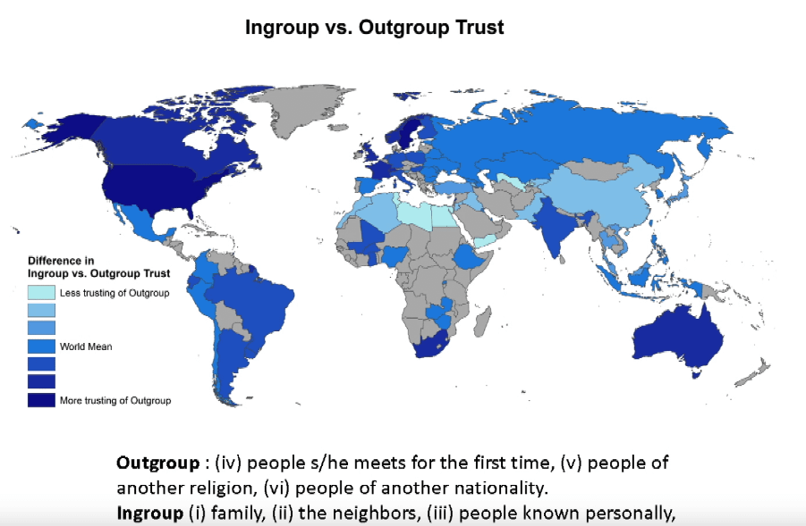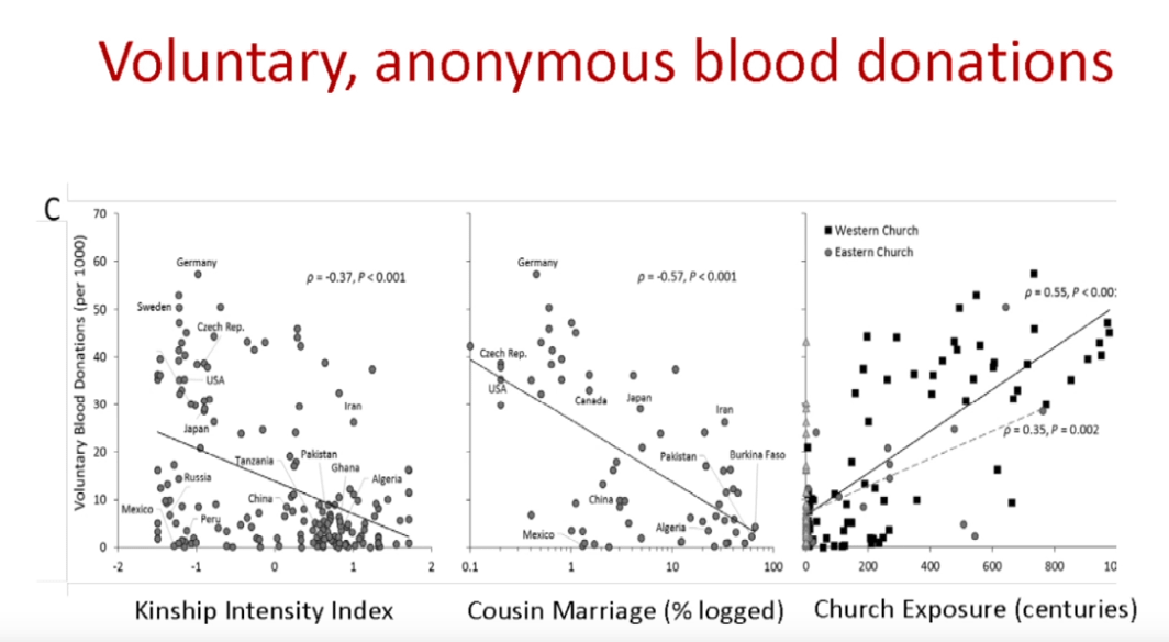 Autres exemples de cette mentalité plus universelle et moins clanique : les Occidentaux ont plus tendance que les autres à faire confiance à des gens en dehors de leur groupe ou à donner leur sang (cf carte et schéma ci-dessous)