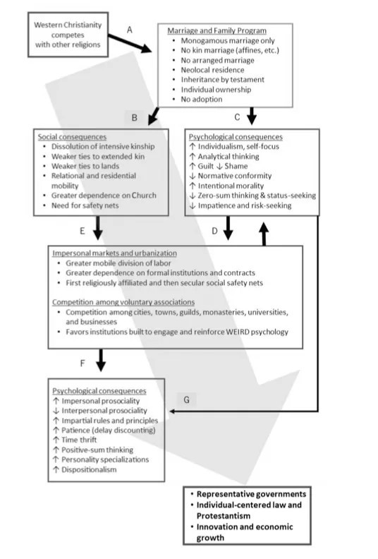 Voici la thèse d'Henrich résumée dans un schéma : de l'établissement par l'Eglise de règles de plus en plus stricte sur le mariage au début du Moyen-Âge jusqu'à l'apparition progressive de la société libérale occidentale contemporaine plus d'1 millénaire plus tard.