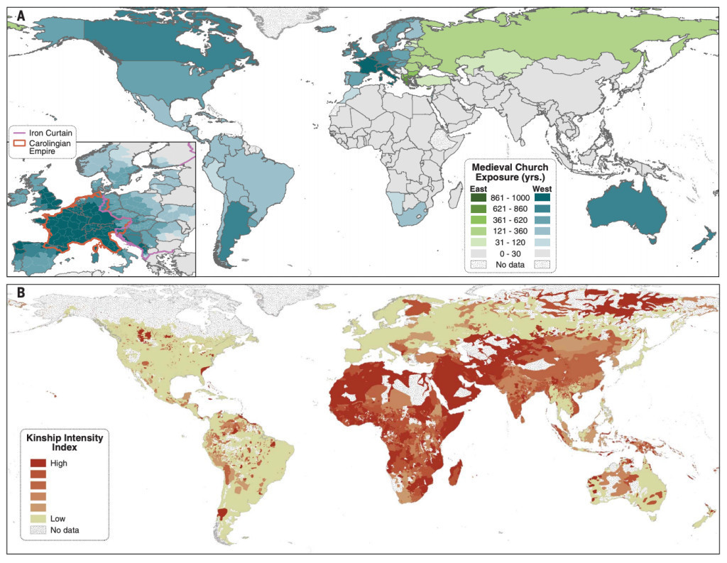 Ces cartes montrent que plus un pays a été longtemps chrétien, plus l'intensité des liens de parenté ou clanique dans sa société sont faibles. L'Afrique et l'Asie, en rouge, affichent un fort taux d'intensité de liens de parenté, au contraire des vieilles régions chrétiennes.