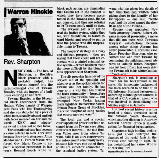 In 1988, in a column for the San Francisco Examiner, ex-Ramparts editor Warren Hinckle alleged that, according to his intelligence sources, Al Sharpton had been "a CIA contract agent who was involved in destabilizing the Manley regime in Jamaica." https://t.co/hHlYurMMH0