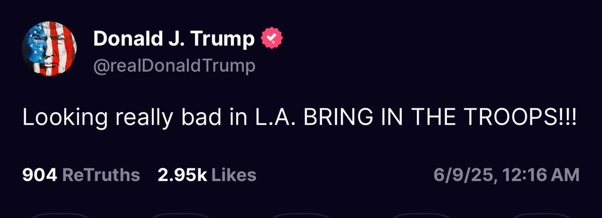 🚨 BREAKING: Trump just posted “BRING IN THE TROOPS!!!” on Truth Social. Things in LA could spiral fast. Wouldn’t surprise me if Trump escalates this. Stay calm, stay peaceful, and stay safe. https://t.co/x5uYfErAaj
