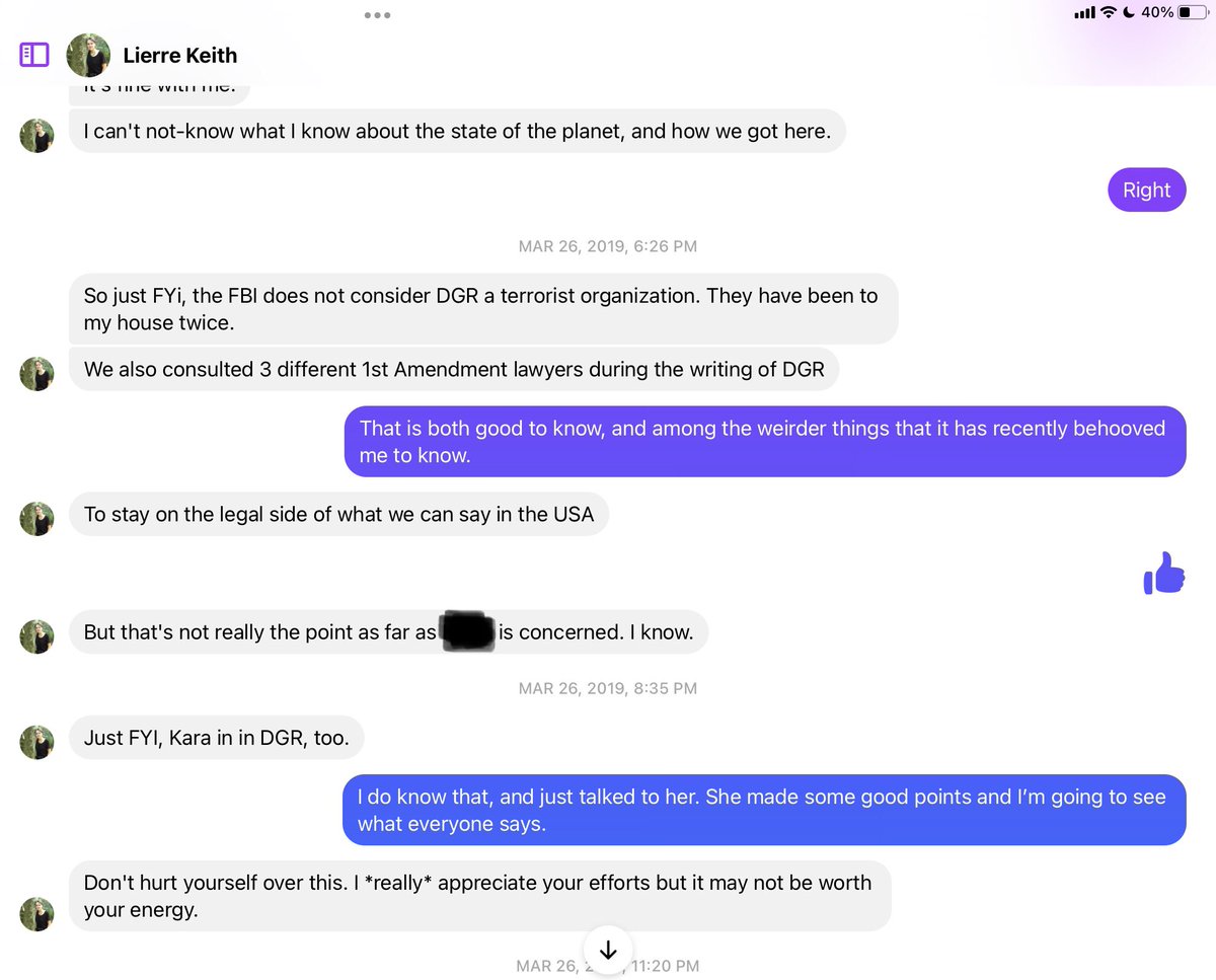 Lierre Keith told me she'd been visited twice by the FBI, who she said established that advocating for ecoterrorism didn't make them terrorists. But consider. Do you think she wants anyone going through her correspondence, DMs, or KiwiFarms activities?