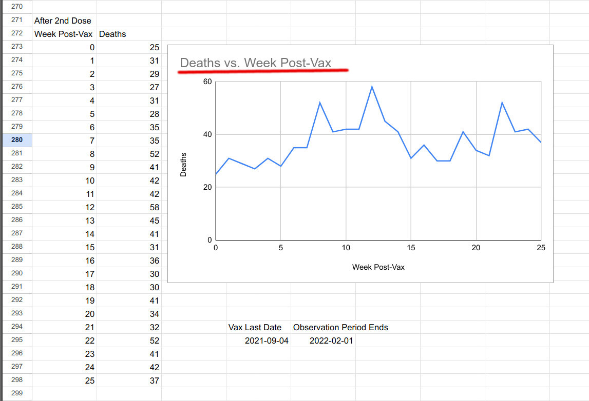 I selected all people who received a SECOND SHOT (regardless of whether they have a record of first or third, etc shots) by Sep 4, 2021, and subsequently died. I looked at all deaths that happened before Feb of 2022.