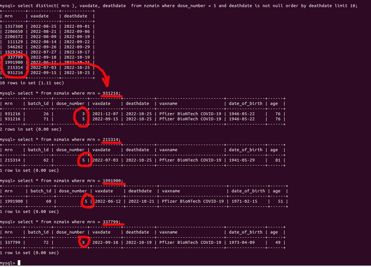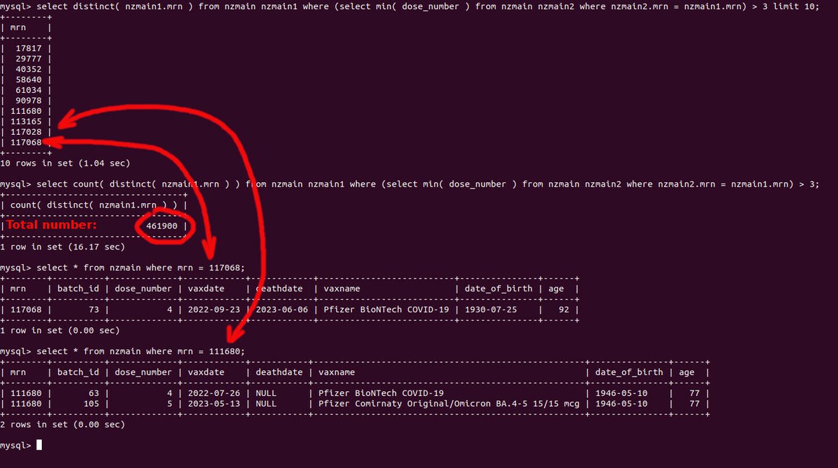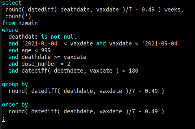 To ensure that every vaccinated person had the same exposure, I only considered deaths within 180 days of vaccination. This way, every vaxed person in the sample had a chance to be exposed for full 180 days, and this ended BEFORE the Covid pandemic started in NZ. My query: https://t.co/BcwPjpsbz8