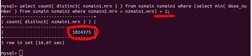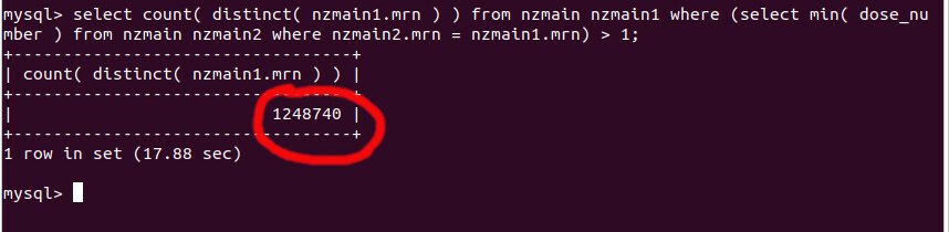 How many people have minimum dose_number 4 and above, and therefore have no records of doses 1-3? The answer: 461,900 people. Here are the queries and samples of such people: