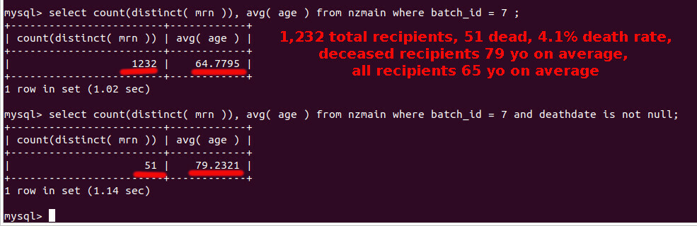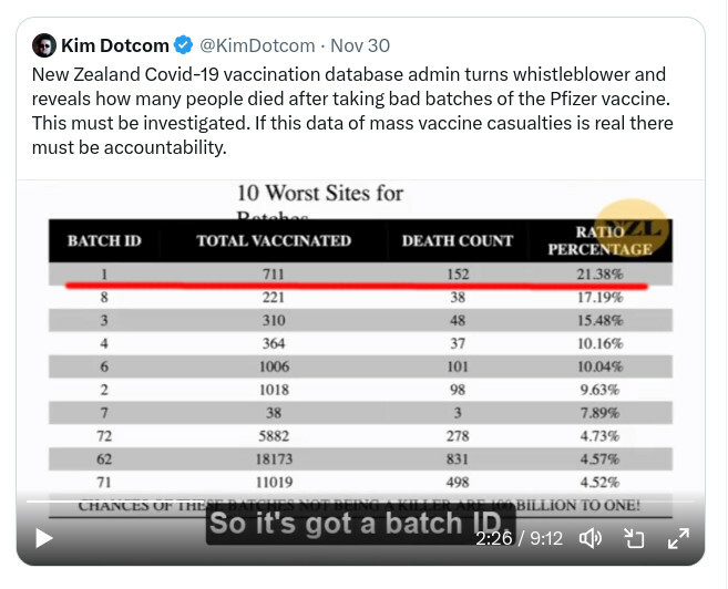 Let's look at Batch 1... This video by Kim Dotcom reports that 21% of people receiving "Batch 1" died. However, the numbers do not match the leaked database, as the next slide will show. The video's underlined like shows 21.38% dead