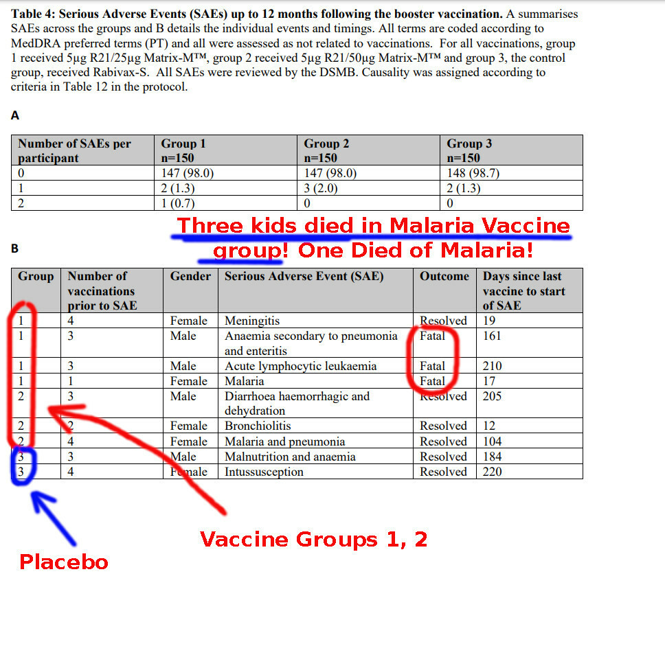 New malaria vaccine R21/Matrix-M in clinical trial: Three infants died - all in the vaccine group. One vaccinated child died of Malaria. Also, leukemia and pneumonia. No deaths in the control group. Study: https://thelancet.com/journals/laninf/article/PIIS1473-3099(22)00442-X/fulltext?ref=warp-news#sec1β¦ Adverse Events: https://thelancet.com/cms/10.1016/S1473-3099(22)00442-X/attachment/72570fb3-cda8-4115-91d7-6b05e6d48391/mmc2.pdfβ¦