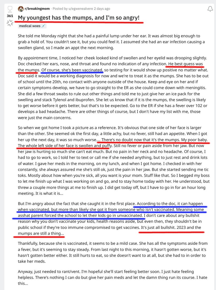 A child VACCINATED for mumps is HAVING MUMPS. The mommy is livid and angry at... unvaccinated people! She does not even KNOW anyone unvaxed for mumps, but she is VERY ANGRY at the unvaxed. (the doctor is feeding this anger) https://www.reddit.com/r/breakingmom/comments/17s4w5q/my_youngest_has_the_mumps_and_im_so_angry/ More on her weird family:π§΅