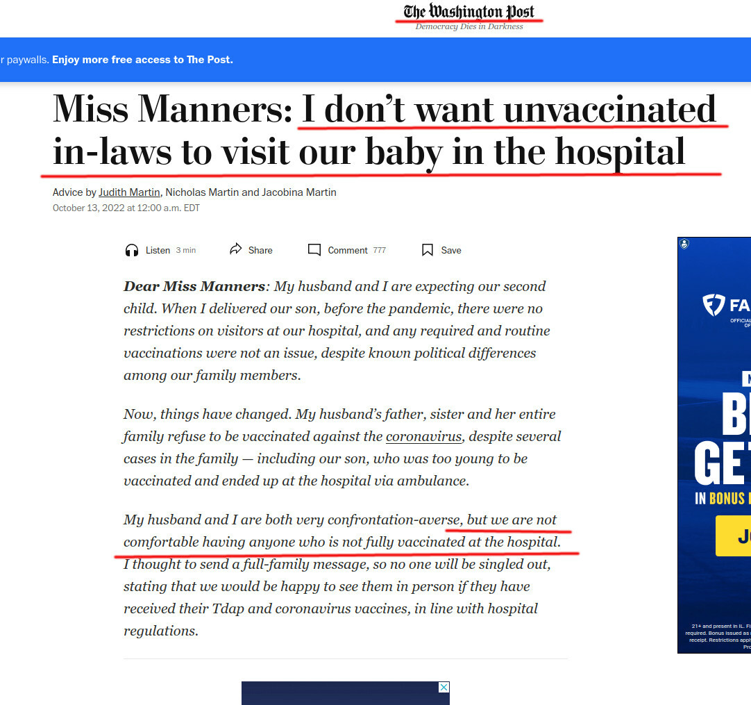 Washington Post, a worthless ideology-obsessed rag that was an interesting newspaper a long time ago, cheers a woman scheming against her unvaccinated inlaws: https://www.washingtonpost.com/advice/2022/10/13/miss-manners-new-baby-vaccines/