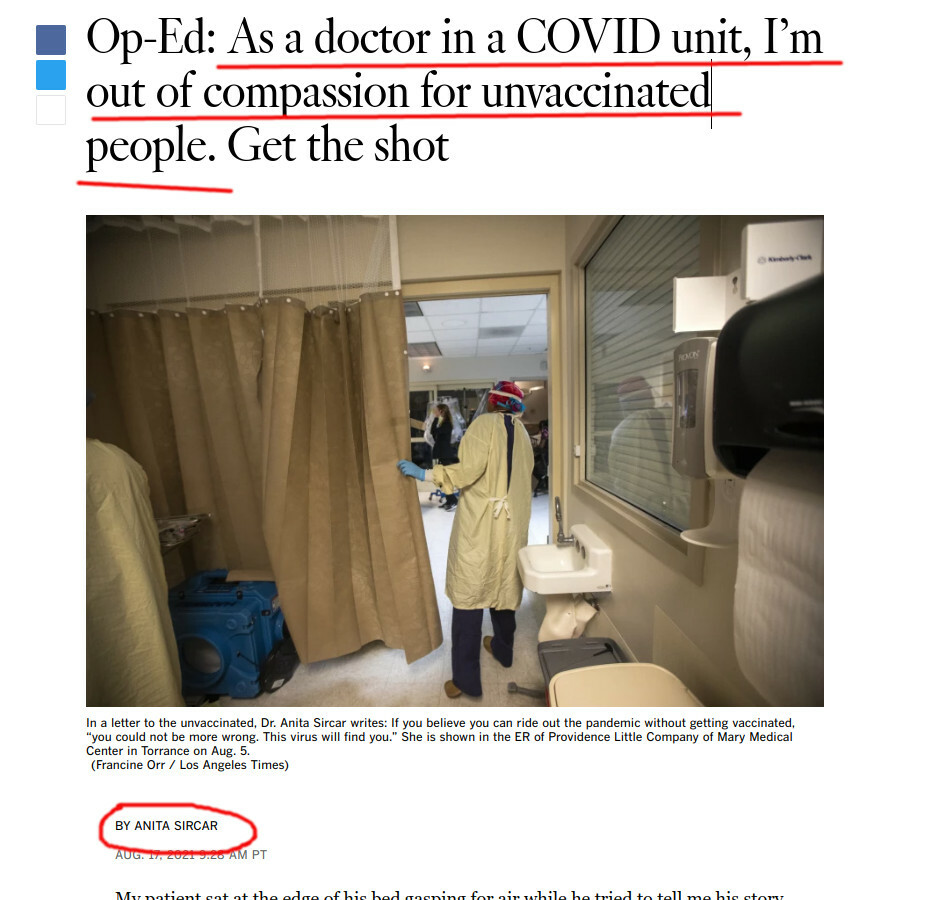 According to the same LA Times, this Dr. Anita Sircar has "no compassion for unvaccinated people". Quite to the contrary, I am very compassionate about vaccinated AND unvaccinated people personally! https://web.archive.org/web/20210817163613/https://www.latimes.com/opinion/story/2021-08-17/vaccinated-covid-doctor-shot