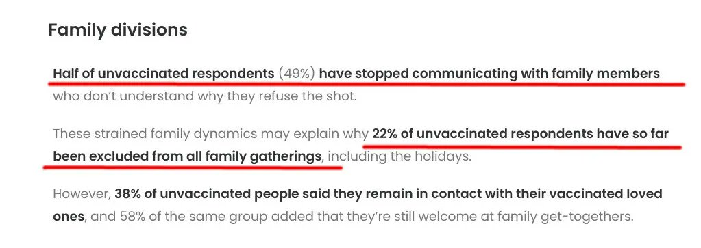 Another poll found that nearly two-thirds of the vaccinated Americans cut ties with their unvaccinated relatives. That campaign of hatred broke millions of families. https://www.onepoll.us/nearly-two-thirds-of-vaccinated-americans-ban-unvaccinated-family-from-their-holiday-gatherings/