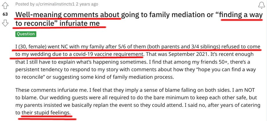 A woman GHOSTED HER ENTIRE UNVACCINATED FAMILY and excluded them from her wedding. She is infuriated by suggestions to reconcile. https://www.reddit.com/r/EstrangedAdultChild/comments/saef5t/wellmeaning_comments_about_going_to_family/