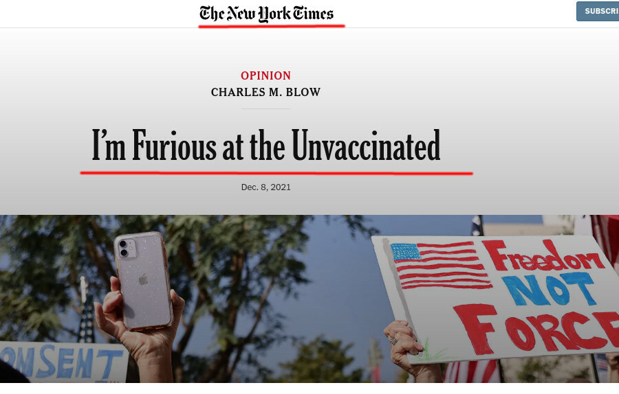 The campaign of hate was relentless. https://web.archive.org/web/20211209020732/https://www.nytimes.com/2021/12/08/opinion/unvaccinated-people-anti-vaxxers.html