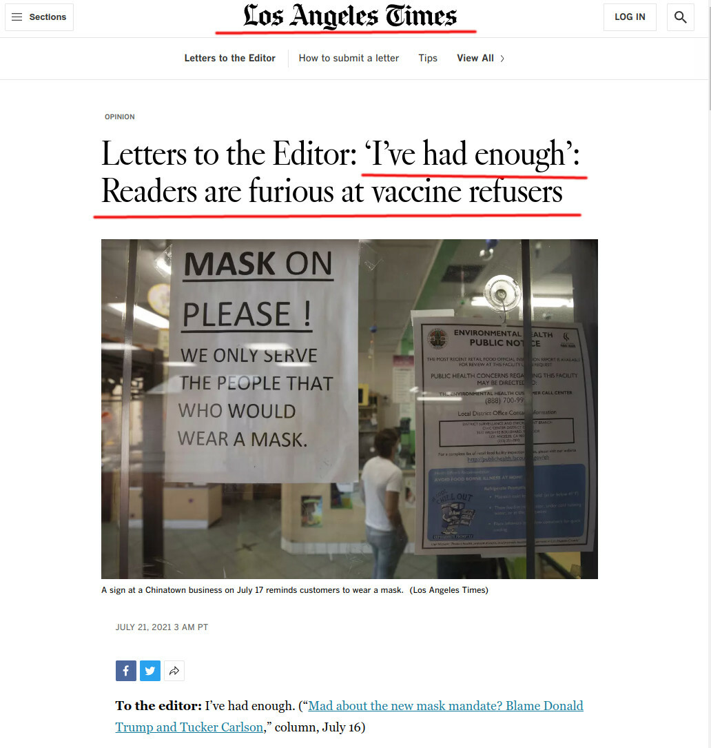 LA Times, a near-bankrupt cesspit of hate against numerous groups of human beings, led the rage in this instance also: https://www.latimes.com/opinion/story/2021-07-21/readers-are-furious-at-vaccine-refusers