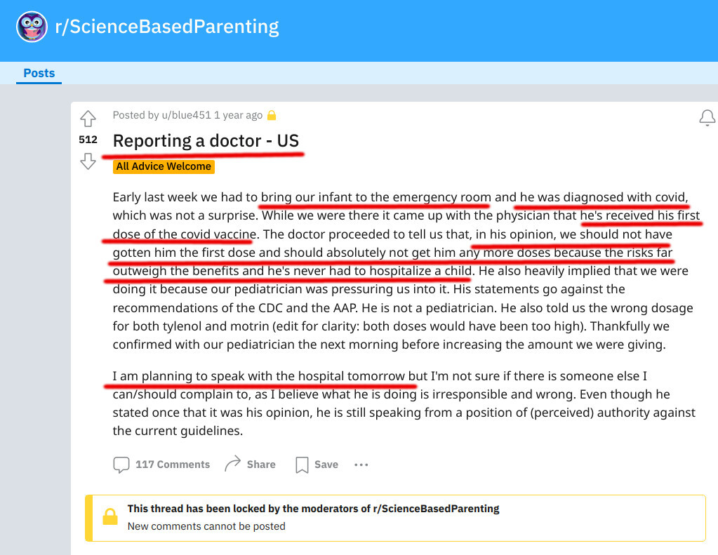 COVID-vaccinated baby was taken to the emergency room DUE TO COVID. The ER's doctor said, do not give the baby any more COVID shots. The mom plans to REPORT THE DOCTOR. (The mommy is also seeing a psychiatrist) https://www.reddit.com/r/ScienceBasedParenting/comments/yo7esg/reporting_a_doctor_us/