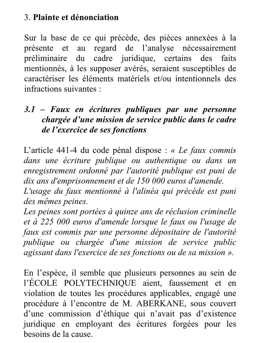 Dans l’affaire des mensonges publics et aggravés de l’école polytechnique, j’ai décidé de porter plainte notamment pour faux en écriture publique (un crime passible de la Cour d’Assise). L’inénarrable Benoît Deveaud est bien sûr abondamment cité mais n’étant pas quelqu’un de particulièrement brillant il est possible qu’il se soit fait manipuler et c’est bien sûr l’enquête qui devra le déterminer. Pénalement, le responsable premier de tout acte répréhensible de l’école est, selon le Code de l’Éducation, son Président Eric Labaye… mais l’affaire commençant en 2017, le Président de l’époque était Jacques Biot (un ancien baron de l’affaire du Sang Contaminé)
