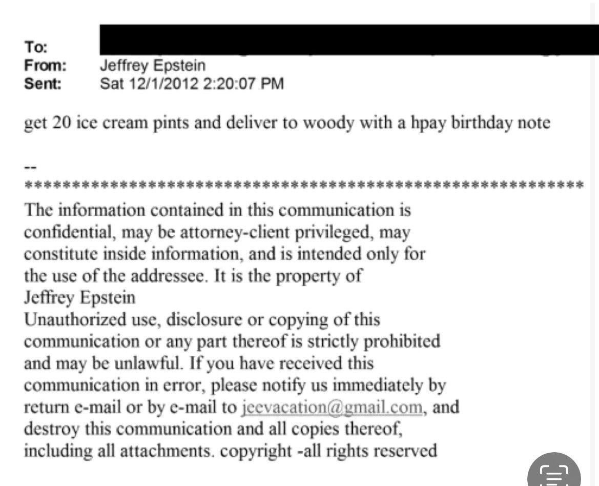 I saw ice cream mentioned and I searched the Epstein files and it get bizzare so I'll make a thread 622 emails but I'll do 10-15 I'll start with Jeffery sending Woody Allen 20 pints of ice cream on his birthday He also sent Woody furniture from Wayfair These are odd gifts https://t.co/tYzwg3VdTj