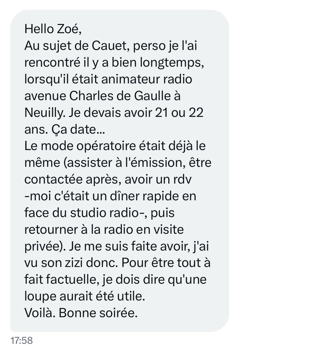 Eh oh c’est donc ça le retour de la méthode @cauetofficiel ? Il faut vraiment arrêter d’envoyer ce genre de sms à des gamines mineures. Tu es assez grand pour savoir que c’est illégal non ? Et puis, est-ce que tu trouves normal qu’une gamine puisse m’écrire en disant : « À l’époque où je n’étais que mineure, j’aimais beaucoup l’émission de radio de Cauet, j’y allais souvent avec des amies. Nous avons pu discuter avec lui, et à plusieurs d’entre nous ils demandaient des photos nues ou comment nous étions habillés le soir etc, il m’a même dit « tu as un beau cul » j’avais 16ans, il a proposé des plans à 3, etc.. Et encore je pourrais en dire d’autant plus, je me suis retrouvé une fois à son hôtel pour discuter simplement, il m’a fait monté dans sa chambre avec une amie et nous a demandé de le su***. Ce « monde » m’a dégoûté 🤢. J’ai encore beaucoup de messages de ses demandes a beaucoup de filles et je précise nous étions MINEURES, il le savait, ça ne le gênait pas tant qu’on « su*** bien », il a des délires très particuliers il a demandé à une de mes amies si elle aimait les « golden shower » car c’était son kiffe de faire ça… il avait beaucoup de filles autour de lui qui étaient prête à faire des choses, j’ai même une proche à lui d’une cinquantaine d’années qui m’a contacté pour que l’on fasse un plan à 3. À un de ses spectacles nous avions le droit d’aller en backstage je comprends mieux pourquoi… ils étaient accompagnés souvent de prostituées. Ce n’est qu’un parmi tant d’autres, mais jouer de sa « célébrité » me donne la gerbe, et d’en voir autant c’est affreux. »