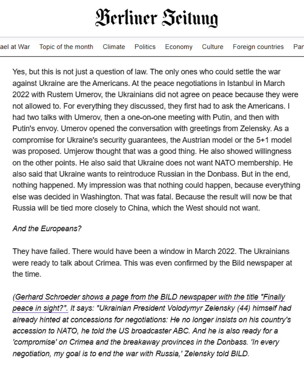 L’Ukraine était prête à signer un accord de paix avec la Russie, mais le gouvernement américain ne l’a pas autorisé. Confirmé par Gerhard Schroeder, ancien dirigeant allemand.. #UkraineRussiaWar️ #USA https://t.co/ySBNNLRu0U
