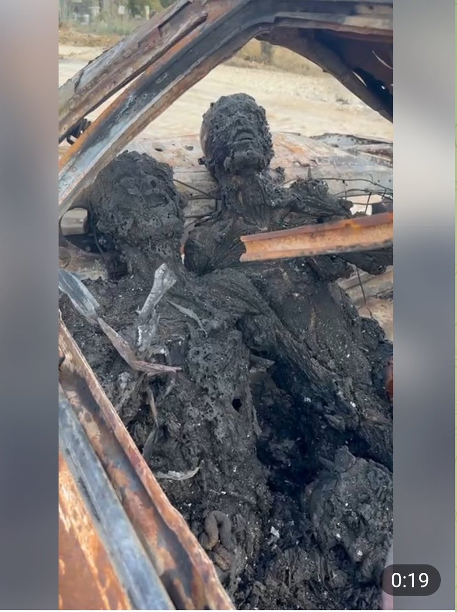 L’une des vidéos les plus horribles de l’après-7 octobre, publiée sur le compte Telegram de South Responders, montre une voiture remplie de cadavres carbonisés (ci-dessous) à l’entrée du kibboutz Be’eri. Le gouvernement israélien a présenté ces victimes comme des Israéliens victimes de la violence sadique du Hamas. Cependant, la carrosserie en acier fondu et le toit effondré de la voiture, ainsi que les corps complètement carbonisés à l’intérieur, témoignent d’un tir direct d’un missile Hellfire. 👇https://t.me/southfirstresponders/149 https://arretsurinfo.ch/les-temoignages-du-7-octobre-revelent-que-larmee-israelienne-bombarde-les-citoyens-israeliens-avec-des-chars-et-des-missiles/